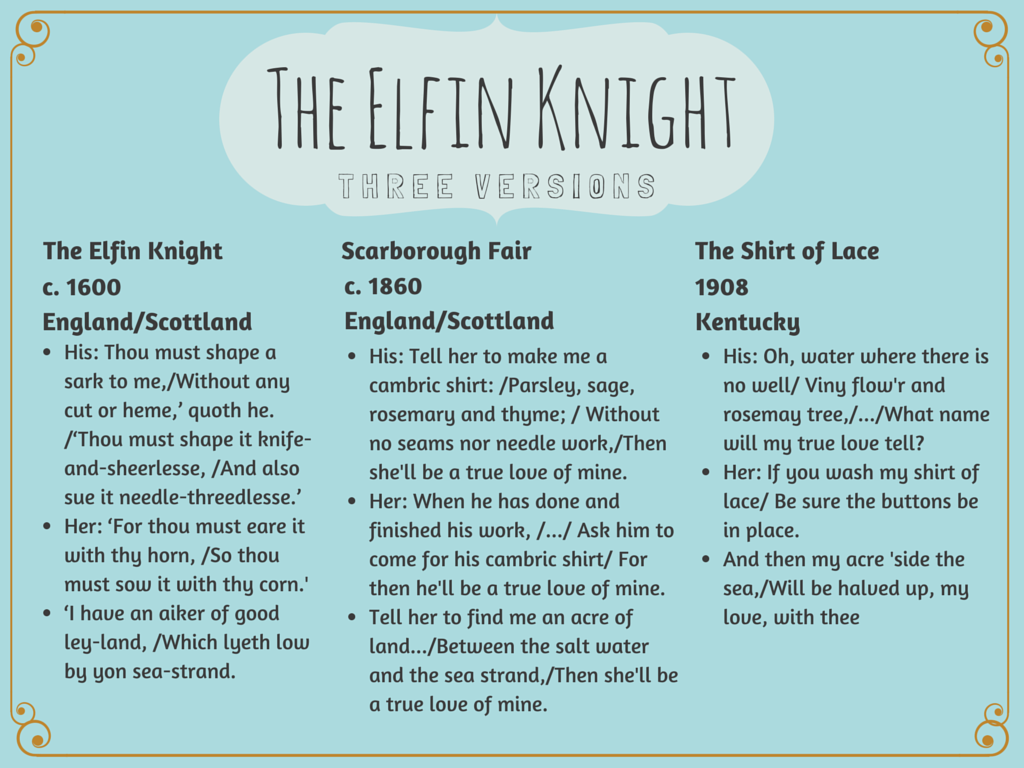 In The Elfin Knight, an Elf, like, you know, a full-grown sprite with pointy ears, comes to the bed of a human maiden (virgin) and asks that she perform an impossible task (namely, sewing a ‘sark’ (shirt) without stitching or using tools). The implication is that if she cannot perform the task, she must have sex with him. In response, the maiden quickly tells him of some land that she will give him if he can perform several real tasks there (mostly manual labor). The Elf then quickly remembers his wife and kids, and tells her he’s no longer interested in her.
